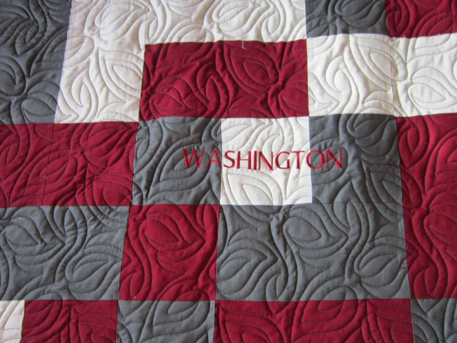 Vikki made these two beautiful quilts. This first one is for her husband for Christmas. She did some machine embroidery on it and it turned out so cool. I quilted "Ground Cover" all over it. She chose a fleece backing for this one and it will be so warm...plus it gave the back a really neat look. Here are some pictures.
