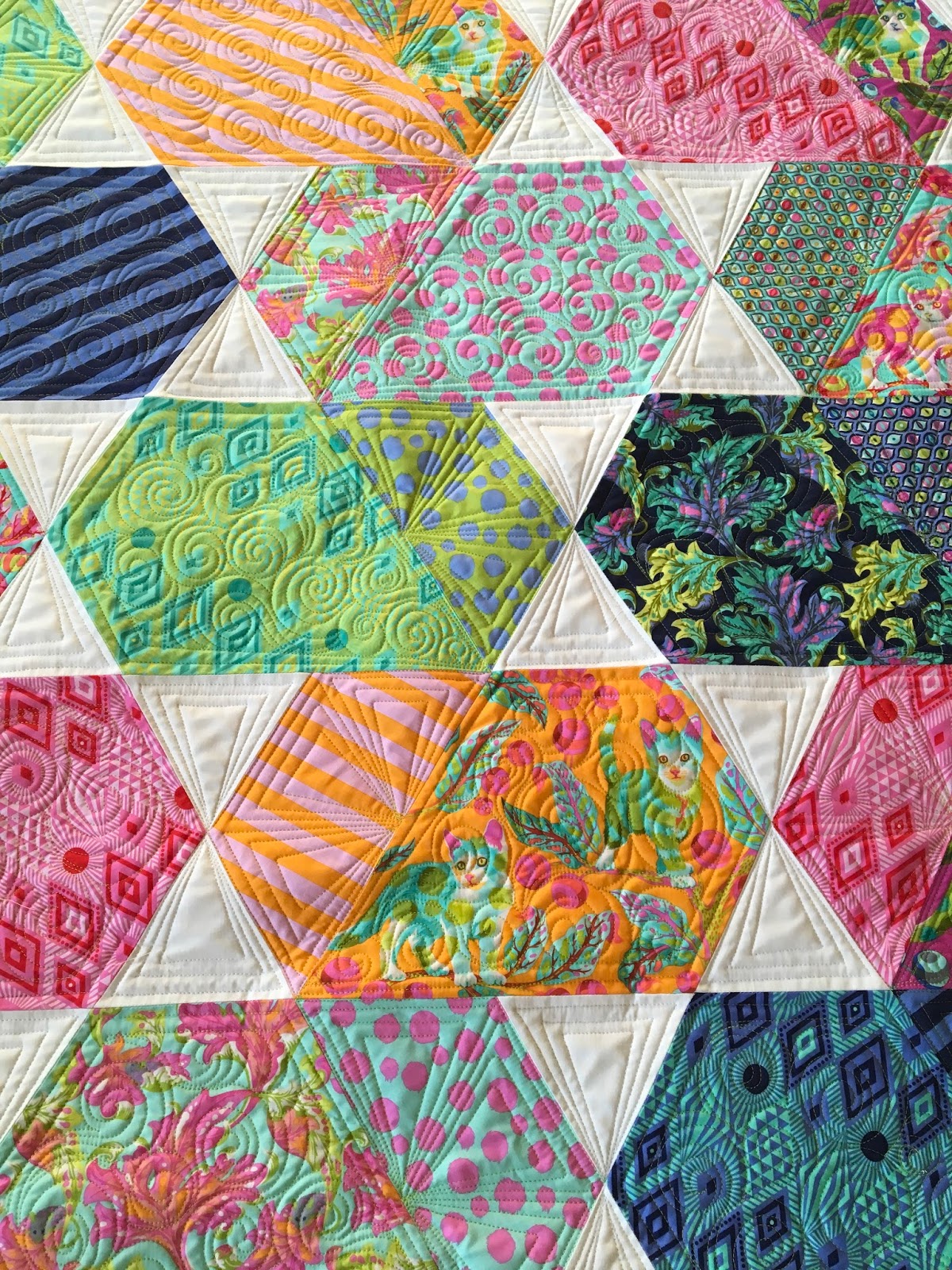 This first quilt is called Comet. It's made using her Hex N More ruler. This amazing fabric is by Tula Pink and is called Tabby Road. It will be available in March of 2017. It's so cute and this pattern works great with the large prints. Really shows the prints so well. And of course Julie always makes her patterns easy to follow and make. I had fun quilting it. Take a look.